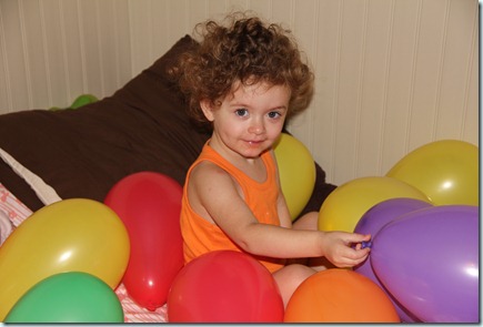 October 10th came and went rather quickly since it fell on a Monday. Anna’s actual birthday party is this Saturday, but I still wanted to honor my baby’s birth date and do a little something special for her. So, Joe and I blew up balloons the night before and put them all over her bedroom floor. Since I had to leave for work early that day and wanted to sing her Happy Birthday before I left, I decided to wake her up by showering her with balloons on her bed.